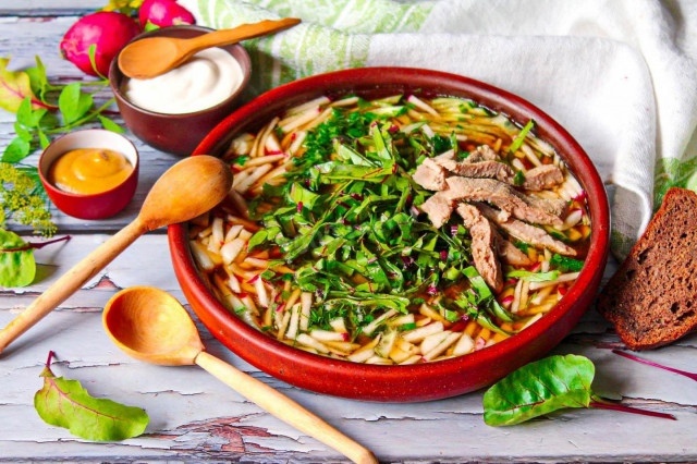 Процеженную бульонную основу следует охладить и добавить к ней квас, затем приправить горчицей и солью по вкусу. Осталось только добавить мясо и свекольную ботву, нарезанную соломкой. Подавайте с ложечкой сметаны, и вкусная летняя ботвинья готова к подаче!