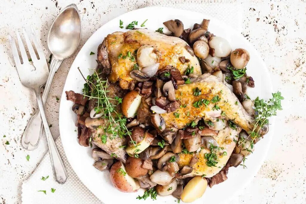 Влейте куриный бульон, вино, добавьте бекон и травы. Доведите до кипения, уменьшите огонь и тушите под крышкой 20-25 минут, пока курица не станет мягкой.