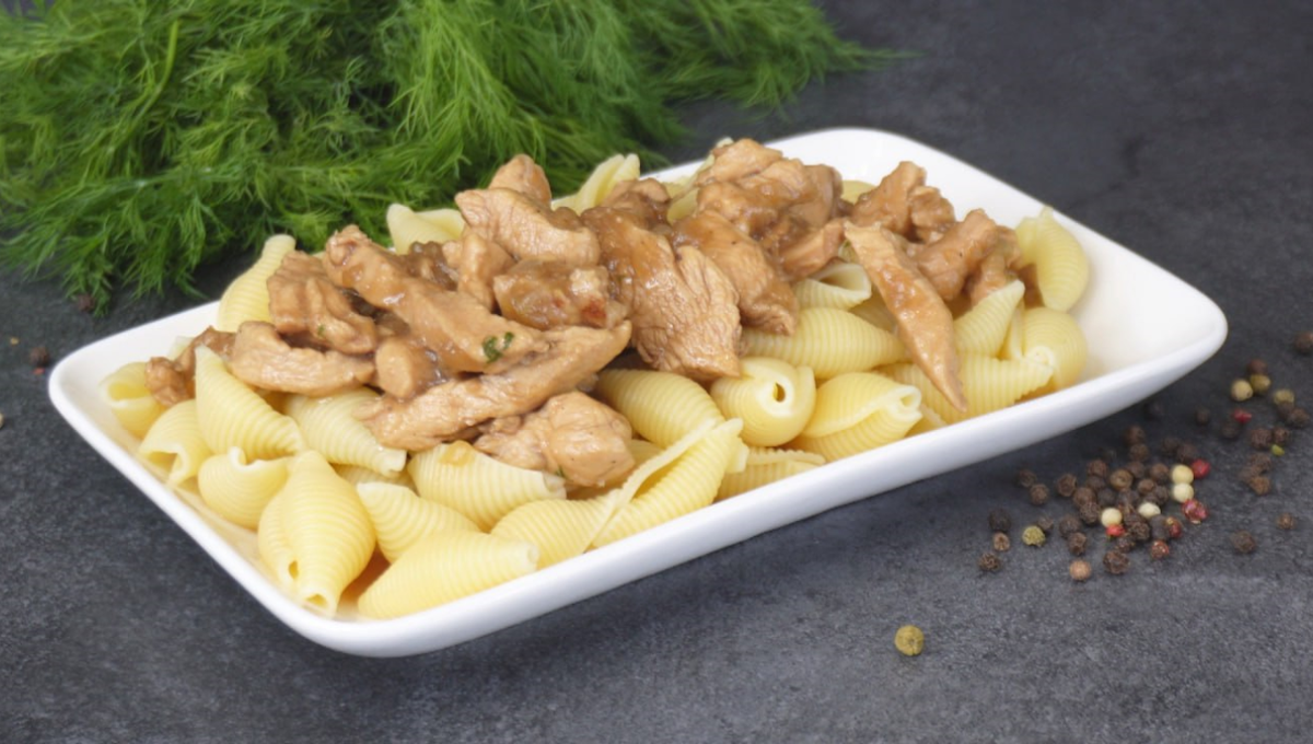 Как только мясо побелеет, в сковороду вливается соевый соус, добавляется прессованный чеснок и немного воды для создания соуса. Блюдо закрывается крышкой и готовится еще 15 минут, в то время как варятся макароны.