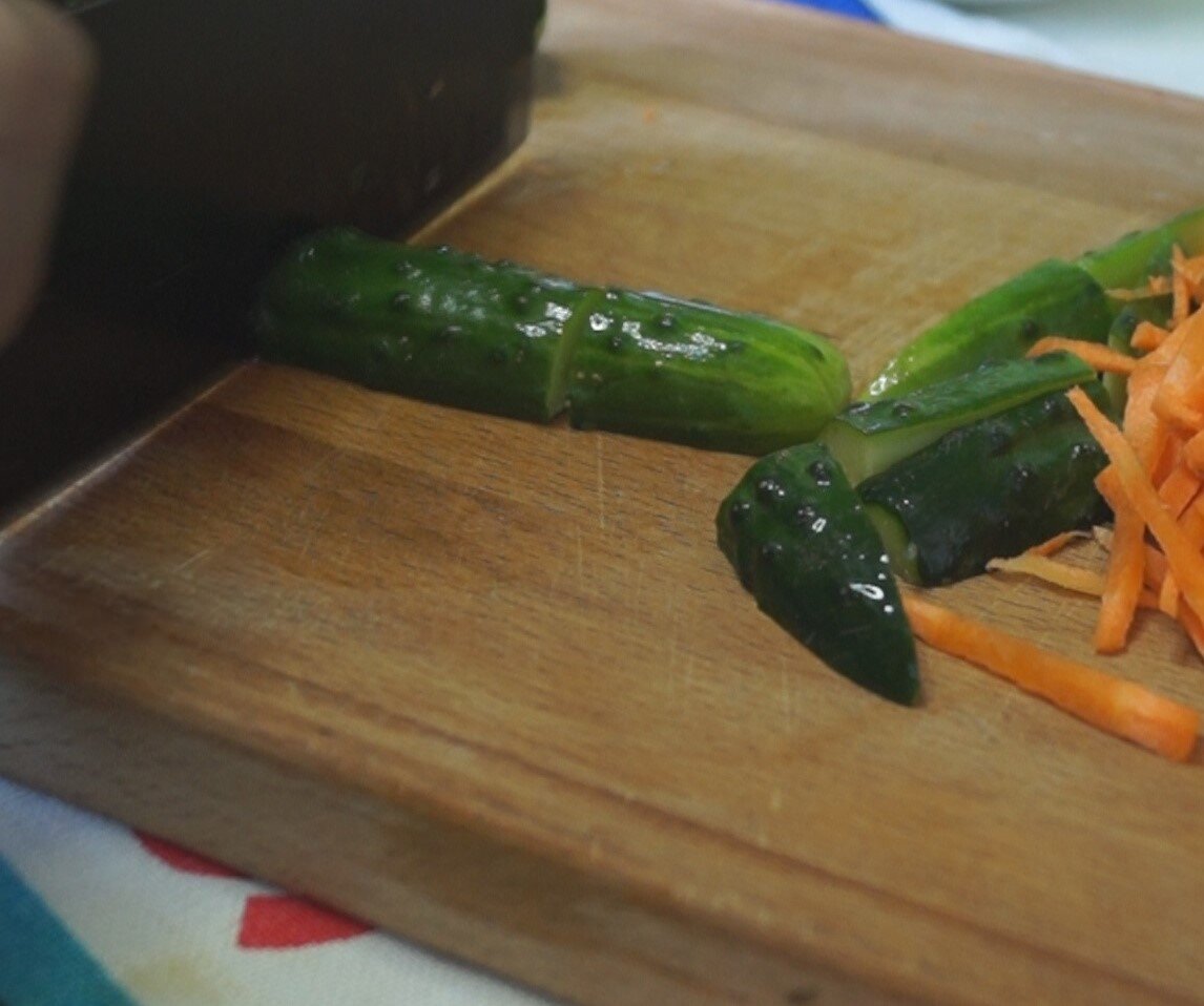 2. По оригинальному рецепту к огурцам добавляется морковь. Ее следует нарезать соломкой или натереть на терке.