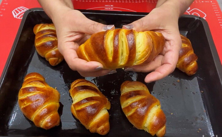 Каждый шарик раскатывается в прямоугольный пласт, который затем смазывается растопленным сливочным маслом. Сворачивание в рулет — это самый захватывающий момент! Концы рулета нужно аккуратно закрепить. Далее, трубочку раскатывают в треугольник, делают надрез в основании и формируют булочки, напоминающие круассаны. Для завершения — три аккуратные насечки сверху и смазка желтком придадут выпечке привлекательный вид.