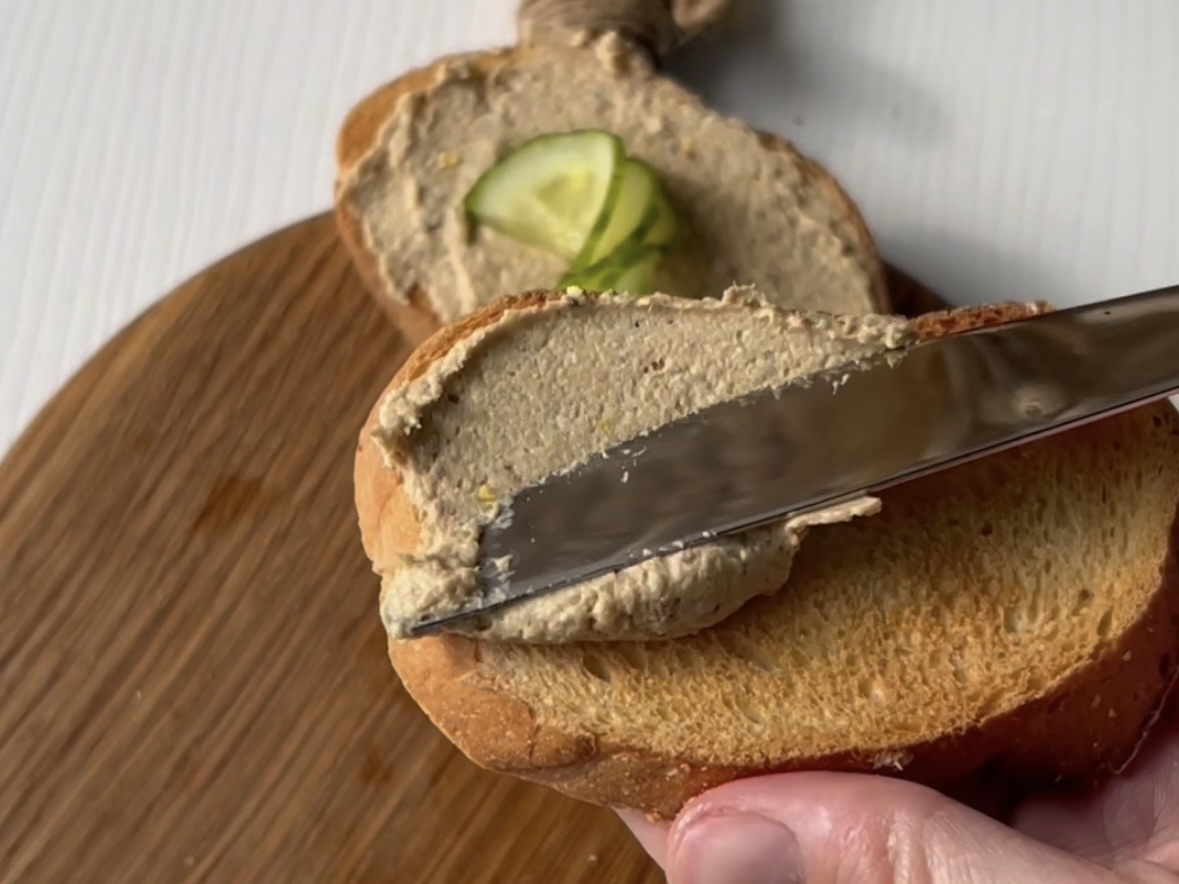 Теперь очередь поджарить батон на сковороде. Получившуюся пасту нанесите на гренки, украсив свежими огурцами и зеленью для яркости. В советские времена эта закуска готовилась проще: шпроты смешивали с вареными яйцами и майонезом, без орехов. В таком случае майонез должен быть пожирнее, желательно 60-70%.
