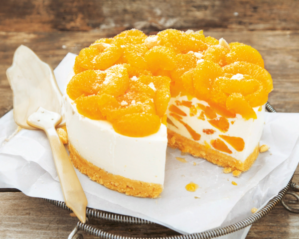 Смешайте сливочный сыр, йогурт и сахарную пудру, добавьте замаринованные мандарины и желатин. Отдельно взбейте сливки и объедините с сырной основой.