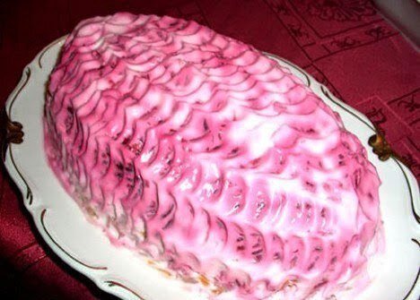 - Пятый слой: натертая свекла, также не забываем про заправку.