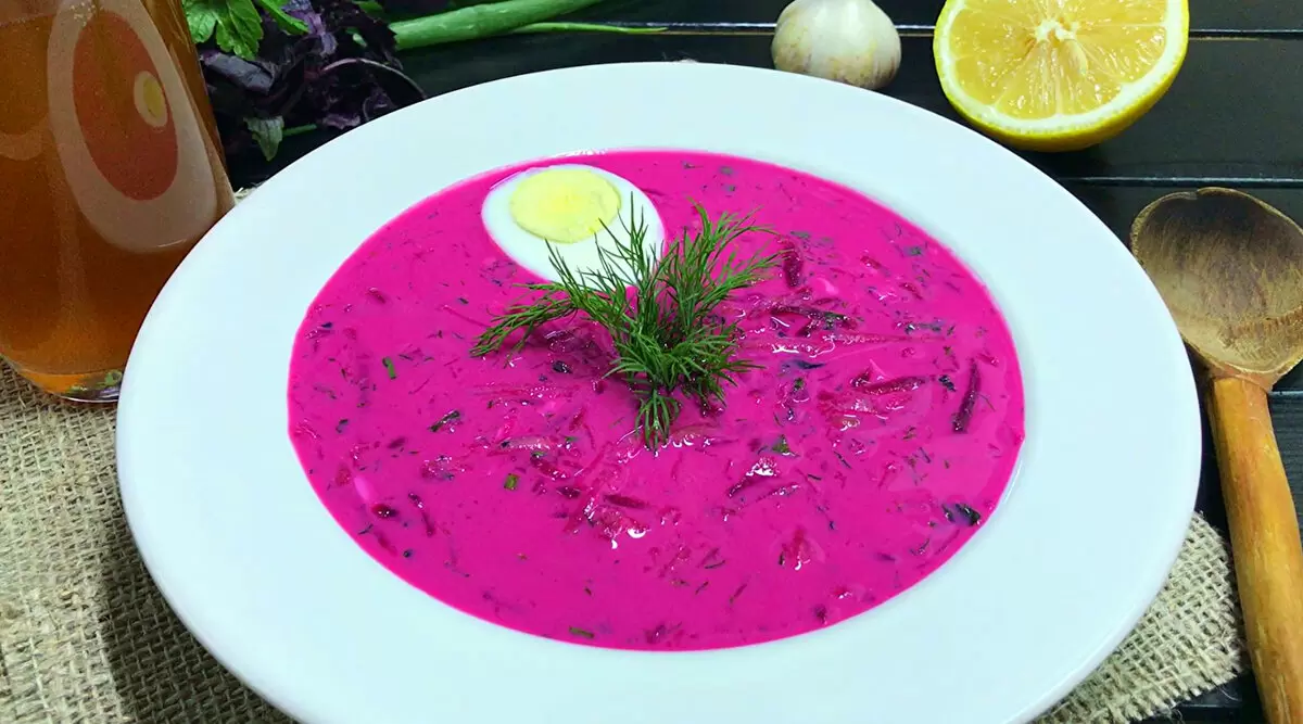 - Ингредиенты: Кефир, яйца, картофель, свекла, огурцы, зелень (укроп, петрушка, базилик, кинза), лимонный сок, соль и перец по вкусу.