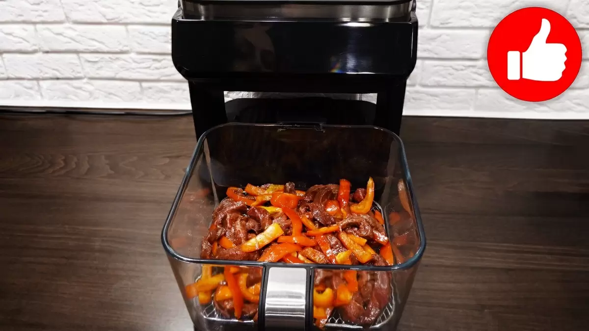 После этого в маринад добавить нарезанный полосками болгарский перец, вновь перемешать и дать настояться ещё 10 минут. Перед началом термической обработки решить вопрос с аэрогрилем: смазать нижнюю решетку маслом и выложить подготовленное мясо с перцем. Готовить на режиме «Мультиповар» при 190 °C в течение 18 минут. Не забудьте за десять минут до окончания приготовления аккуратно перемешать содержимое.
