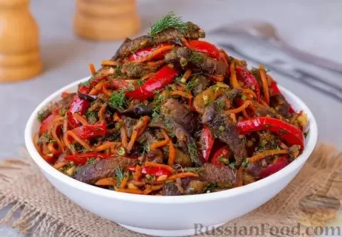 Первый в этом списке салат — сытное блюдо из куриной печени, моркови, консервированного горошка и варёных яиц. Здесь каждый ингредиент дополняет друг друга, создавая гармоничное сочетание. Нежная куриная печень, сладкая обжаренная морковь и свежий зелёный горошек в тандеме с ароматным зелёным луком делают этот салат идеальным как для повседневного, так и для праздничного стола.