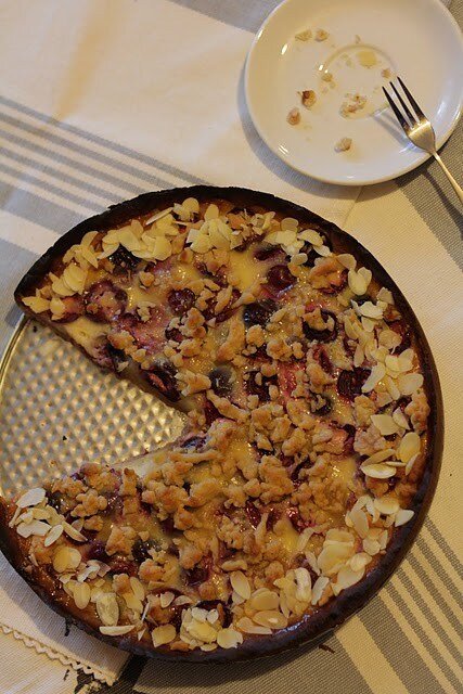Начните с ягод. Извлеките косточки из черешни и вишни, чтобы подготовить их - вам понадобится примерно по небольшой миске каждой.Для теста перетрите 0,5 стакана миндаля до состояния пасты. В большой миске смешайте 7,5 столовых ложек муки, 70 граммов масла и 4 столовые ложки фруктозы. Затем добавьте измельченный миндаль и яйцо, замесите тесто и оставьте его в холодильнике на 30 минут.Приготовьте заварной крем: доведите молоко до кипения в одной кастрюле, в другой смешайте 2 столовые ложки муки, 4 столовые ложки фруктозы и 3 яйца. Смешайте обе массы и поставьте на медленный огонь, постоянно помешивая, до загустения. В конце добавьте кокосовую стружку.Приготовьте штрейзель, смешав 2,5 столовые ложки муки, 20 граммов масла, 2 столовые ложки фруктозы и измельченные орехи.Раскатайте тесто и выложите его в форму для выпечки, заливайте заварным кремом и распределите ягоды. Выпекайте до легкой корочки, затем посыпьте штрейзелем и продолжайте выпекать еще 30-40 минут.Совет от шефа