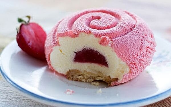 Формочки наполовину заполнить баварским кремом, затем вставить полусферы из клубничного конфи и залить оставшимся муссом. Убрать в морозильник. На следующий день, опустив формочки в теплую воду, извлечь пирожные и украсить розовым велюром и свежими ягодами.