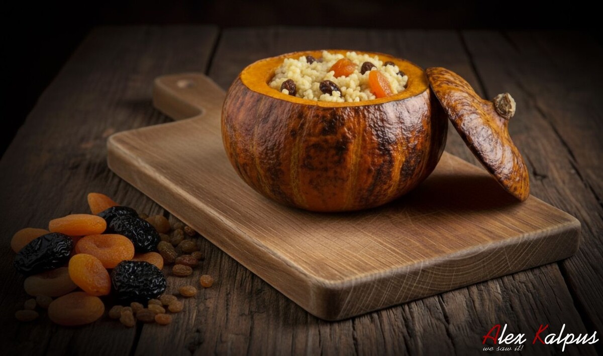Для начала тыкву нужно хорошо промыть и вырезать верх, чтобы сформировать "крышку". Затем готовится начинка из риса, который отваривается до полуготовности, и смешивается с сухофруктами и медом. Тыкву заполняют начинки, закрывают её "крышкой" и запекают в духовке до готовности. Подача этой тыквы, нарезанной на дольки, украшенной орехами, станет ярким акцентом на любом столе.
