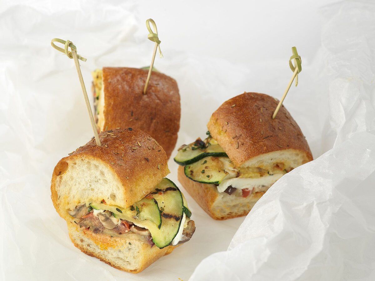 Нарезать помидор, цукини, баклажан и грибы кружочками, полить двумя столовыми ложками оливкового масла. Для особого аромата можно добавить тимьян и оставить мариноваться на 10-15 минут. Обжарить все на гриле или на раскаленной сковороде, затем охладить и отправить в холодильник на полчаса.Моцареллу нарезать толстыми ломтями, а оливки – мелкими кусочками.Смешать майонез с йогуртом, посолить и поперчить по вкусу.Разрезать булочку на две части вдоль, обжарить внутренние стороны на оливковом масле до хрустящей корочки.Нанести соус из майонеза на внутренние стороны булочки. Выложить одну половинку начинкой из баклажанов, цукини, помидоров, грибов, оливок и моцареллы, затем закрыть второй половинкой, зафиксировать шпажками и нарезать на четыре части перед подачей.
