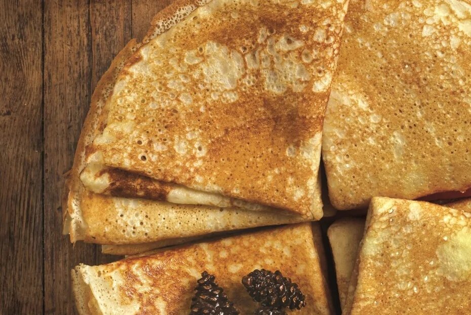 5. Снять готовый блин со сковороды и разложить его на плоской тарелке. Одну половину смазать сладким творогом и сложить пополам, затем повторно намазать творог и сложить, чтобы получить треугольник.