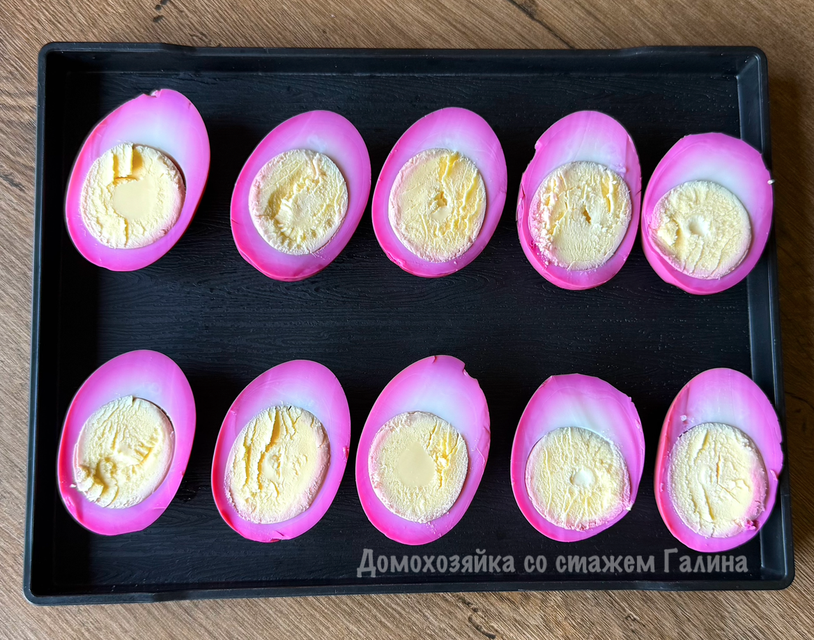 А вот такой необычный розовый цвет яиц делает их не только вкусными, но и по-настоящему привлекательными на тарелке. Чтобы добиться этого эффекта, можно воспользоваться свекольным соком.