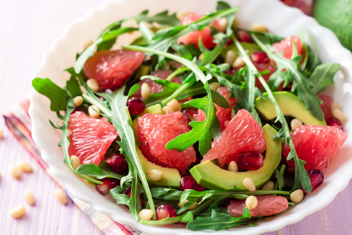 Салат с грейпфрутами, авокадо и орехами имеет множество достоинств благодаря своим ингредиентам: