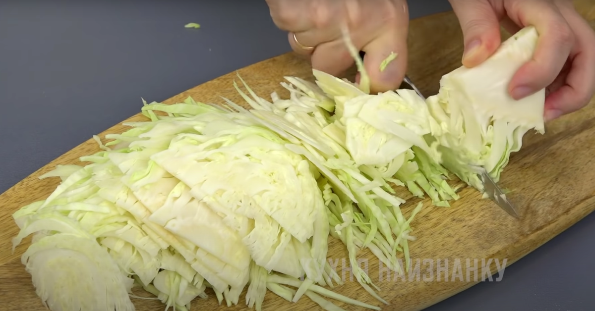 Для начала, капусту следует нарезать тонкой соломкой. Можно использовать специальную терку для ускорения процесса или нарезать ножом — на выбор. Затем капусту нужно немного «помять» руками, чтобы она стала мягче.
