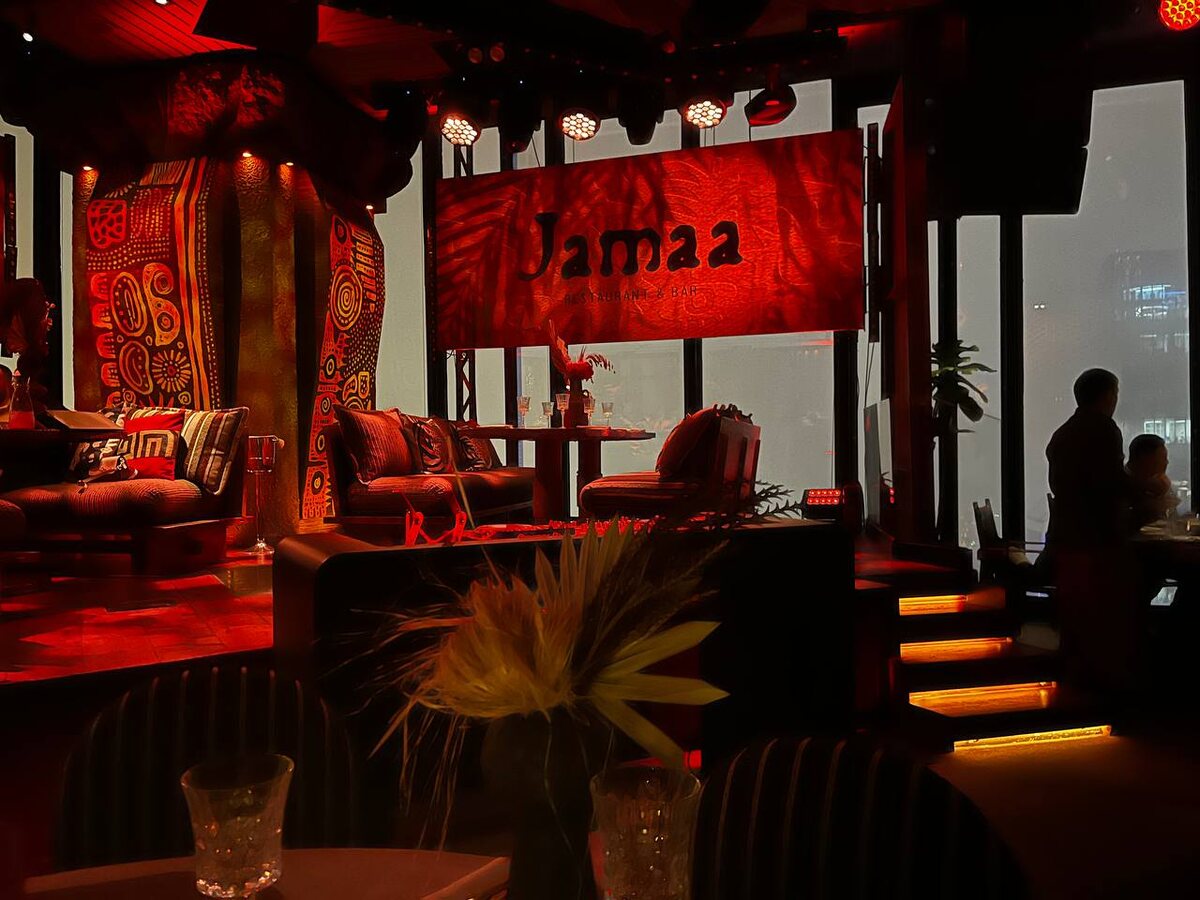 Панорамные виды на мегаполис придают ресторану Jamaa особый шарм. Дизайн интерьера — это сочетание современных решений с яркими этническими элементами, созданными благодаря поездке владельца в Южную Африку. Стены украшены африканскими масками, а коммунальный стол, выполненный в форме традиционной лодки, создает атмосферу единства и общности.