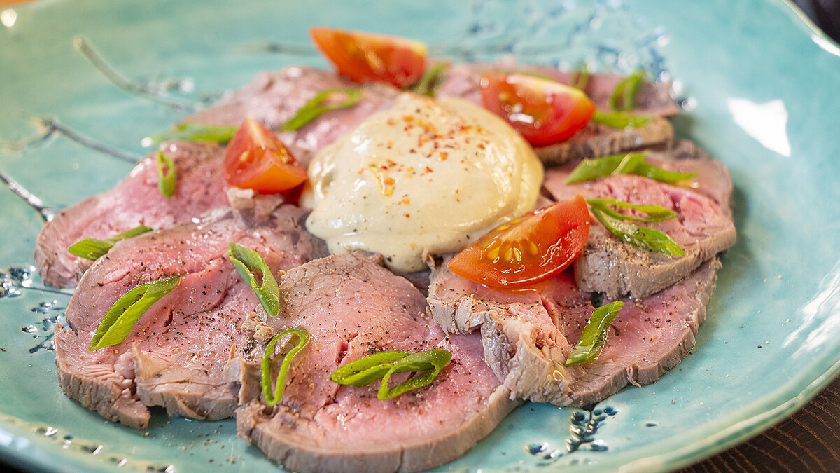 Снимите шпагат с остывшего мяса и нарежьте его тонкими ломтиками. Выложите их на тарелку, щедро полейте тунцовым соусом и украсьте свежими томатами и зеленым луком. Это блюдо станет настоящим украшением вашего стола. Приятного аппетита!