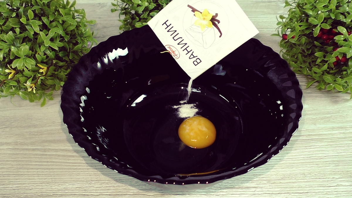 Сначала в миске нужно смешать яйцо с щепоткой соли и добавить ванилин или ванильный сахар. Затем влить сахар и тщательно все перемешать.