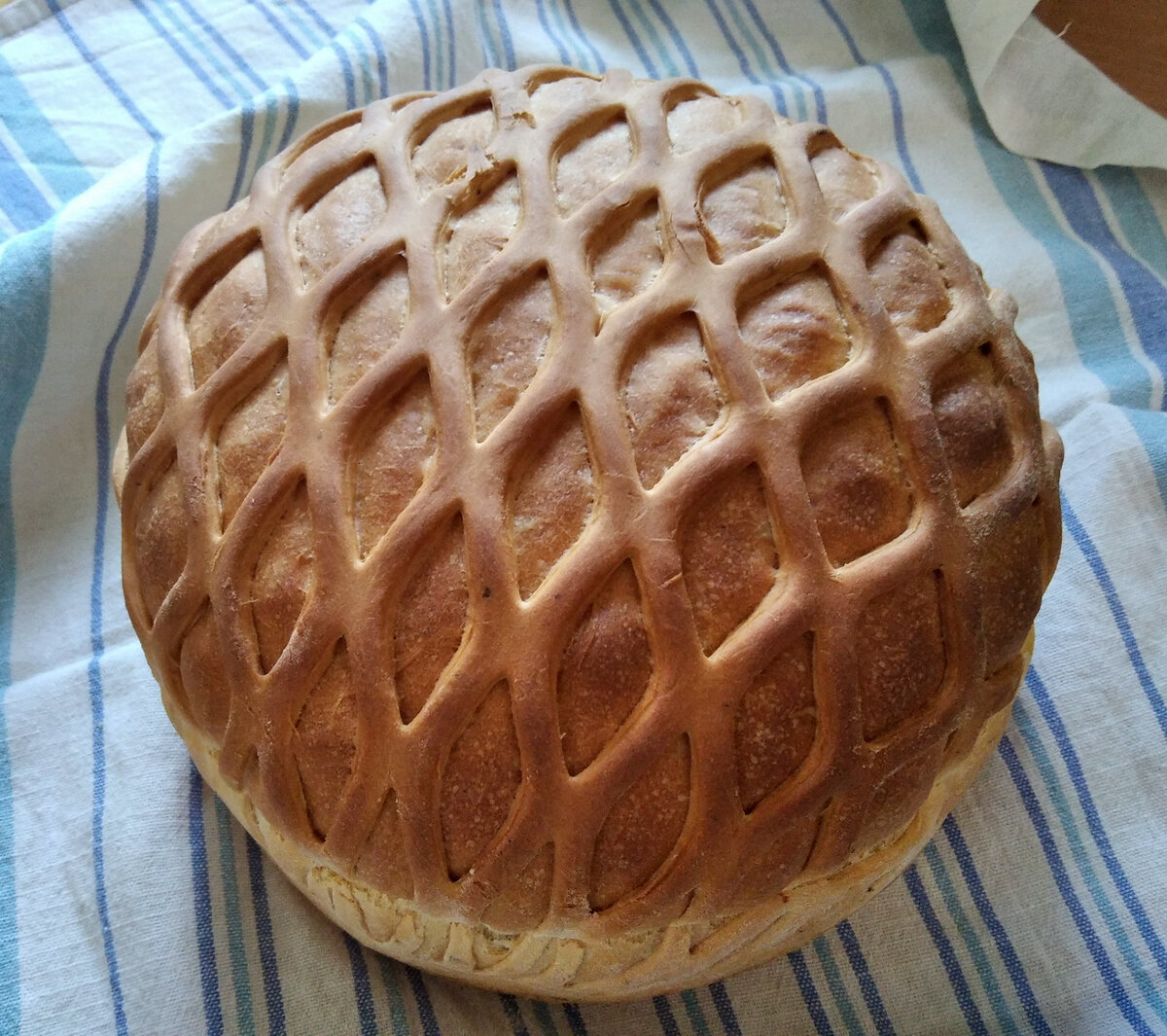 После завершения выпекания хлебу нужно полностью остыть, прежде чем его нарезать. В этот раз форма хлеба была украшена аккуратными узорами с помощью специального резака-сеточки, придавая ему привлекательный вид.