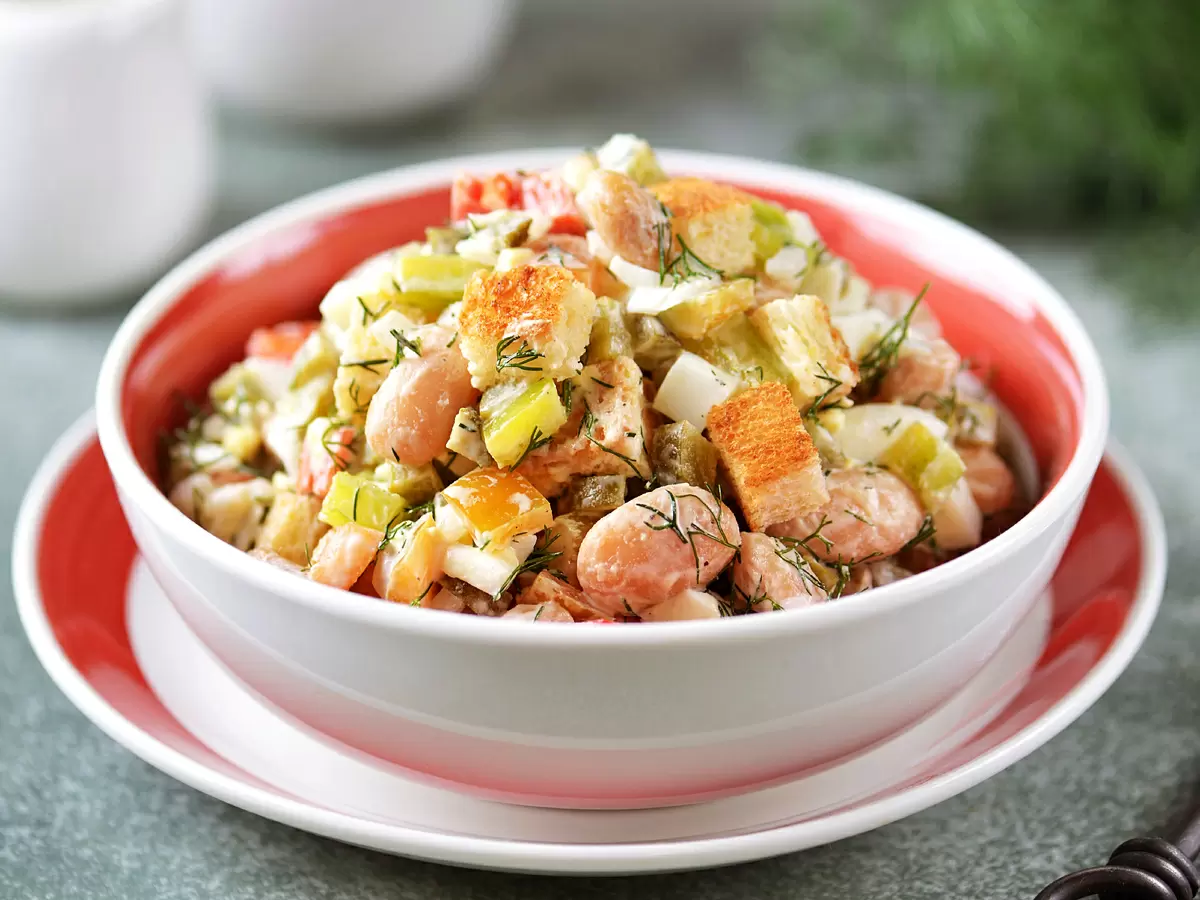 Начните с того, что необходимо откинуть белую фасоль на дуршлаг и тщательно промыть. Параллельно можно варить яйцо: достаточно 10 минут после закипания. Затем обработайте хлеб — нарежьте его мелкими кубиками и поджарьте на сухой сковородке до золотистой корочки, чтобы он стал хрустящим.