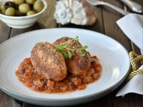 Разлейте соус по керамической форме, уложите сверху котлеты и запекайте в предварительно разогретой духовке при температуре 180-200 градусов в течение 10-15 минут.