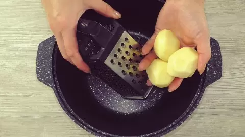Для начала, натереть картошку на крупной терке. При необходимости можно слегка отжать. Затем добавьте яйца, соль и перец, тщательно перемешайте все ингредиенты. На разогретую сковороду с небольшим количеством растительного масла выложите половину картофельной массы и разровняйте.