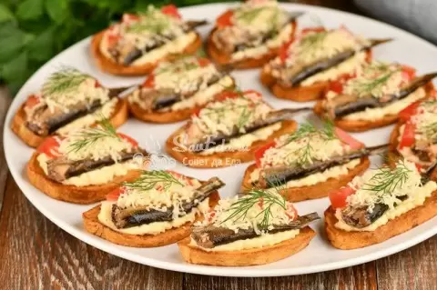После того, как смесь готова, подсушите 8 ломтиков ржаного или пшеничного хлеба в духовке, остудите их и щедро намажьте сырной смесью. Поверх нее разместите шпроты и ломтики свежих помидоров, а для завершения добавьте укроп. Получается идеальное сочетание хрустящей основы и насыщенного вкуса.