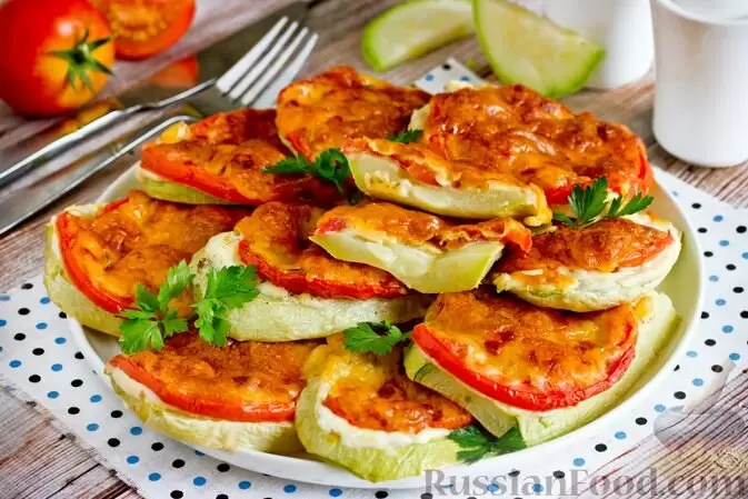 - Кабачки, запеченные с помидорами и сыром – отличная альтернатива мясным блюдам. Простота и оригинальность помогут удовлетворить даже самых привередливых.