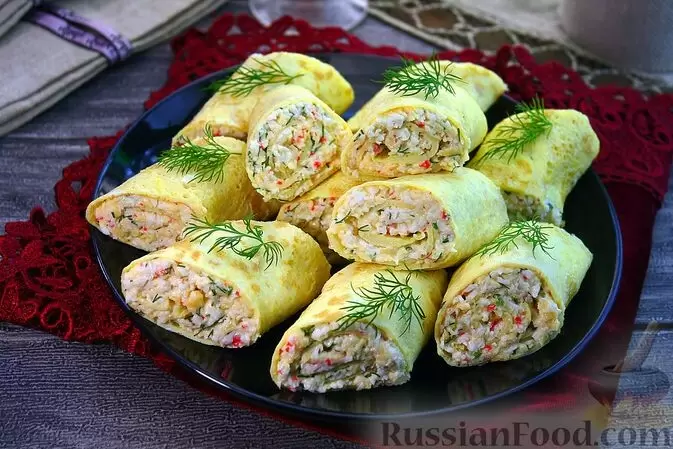 Яичные рулетики с крабовыми палочками — это сочное сочетание нежных блинчиков и ароматной начинки из крабов и сыра дополнит ваше праздничное меню. Для усиления вкуса в начинку можно добавить немного чеснока, что придаст закуске пикантности.