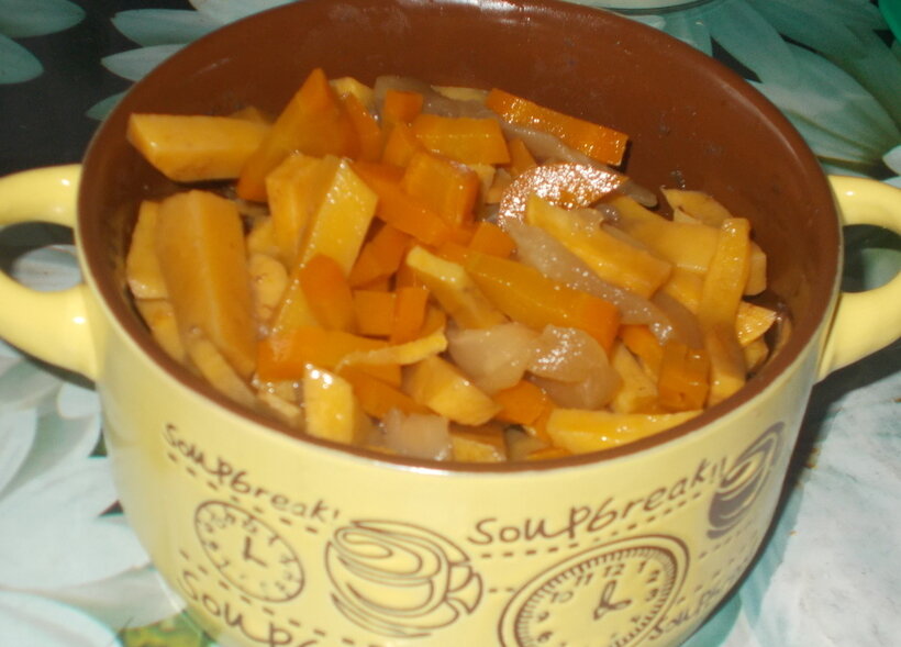 Первым шагом в приготовлении станет нарезка репы и моркови на тонкие полоски. Узкие ломтики помогут овощам быстрее запечься и равномерно пропитаться медом. Далее овощи укладываются в форму для запекания: сначала следует расположить морковь, затем репу. Для того чтобы придать блюду дополнительный вкус, поверхность овощей следует смочить водичкой и щедро полить медом.