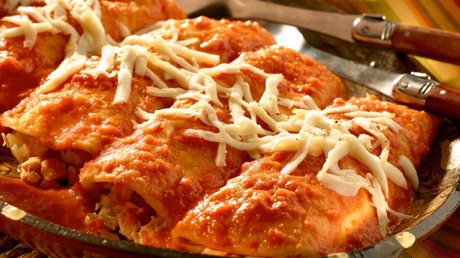 Тортильи стоит разогреть на тефлоновой сковороде или в микроволновке. На каждую тортилью выложить овощную начинку, завернуть в трубочку и поместить на смазанный маслом противень. Полить острым соусом, посыпать тертым сыром и запекать в духовке при температуре 160°C в течение 2–3 минут.