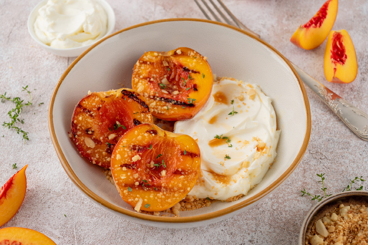 Зачастую лучшие кулинарные произведения не требуются сложных техник — они создаются из качественных ингредиентов, удачно сочетаясь друг с другом. Запечённые персики являются прекрасным примером такого блюда. Этот десерт не пестрит деталями, однако его вкус раскрывается во всей своей многогранности: сладкие, спелые фрукты, тёплая мёдовая карамель, нежная текстура и травяной аромат создают неповторимое сочетание.