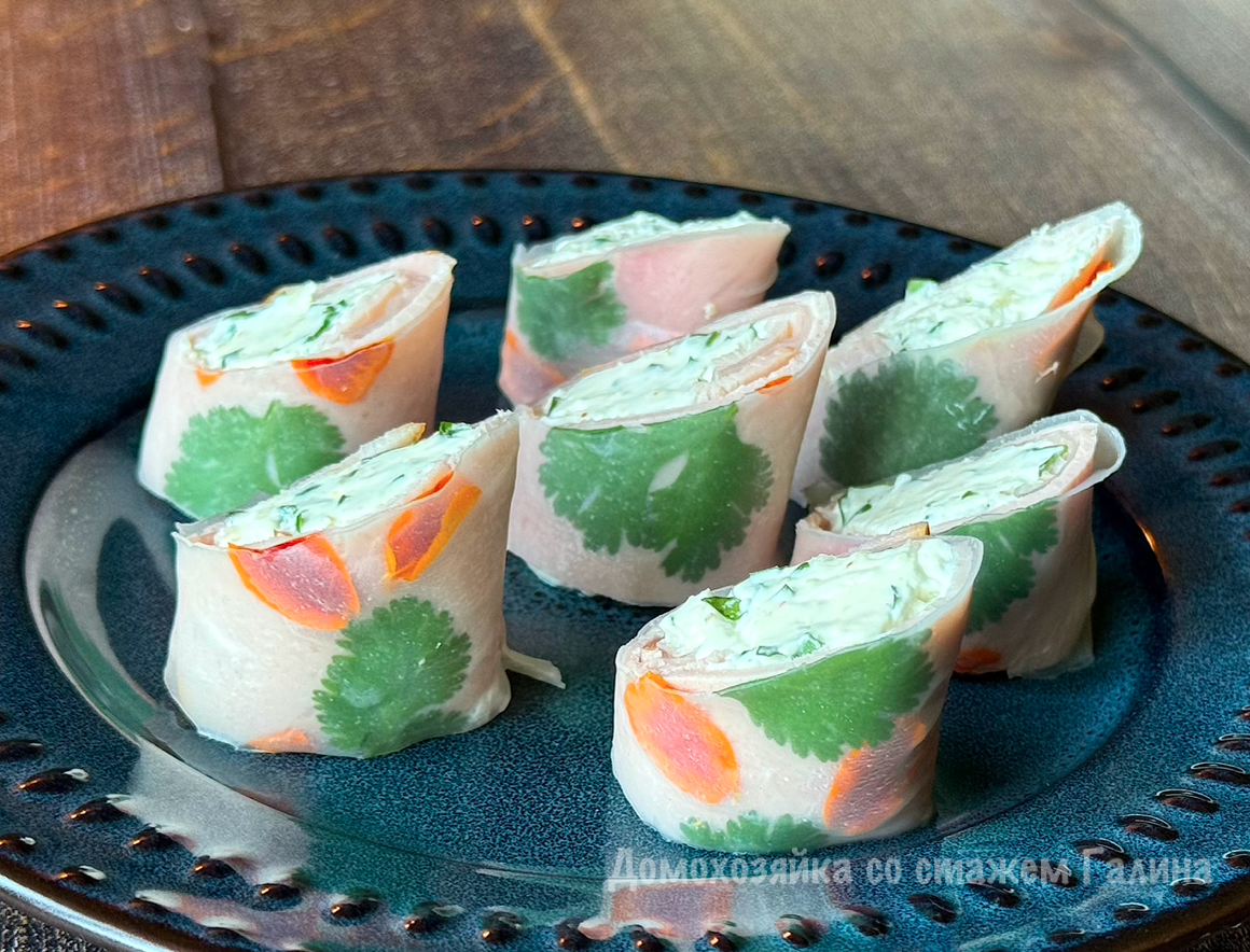 На кухне эксперименты часто бывают как удачными, так и менее успешными. Например, для начинок к рулетикам можно использовать совсем другие комбинации. В этом случае вместо обычного сыра с майонезом была выбрана более интересная альтернатива — творожный сыр с грецкими орехами, пармезаном, чесноком и свежей кинзой. Уникальная начинка была подана в кулинарном мешке, что значительно облегчало процесс свертывания рулетиков!